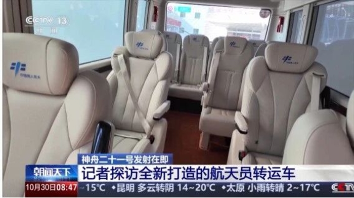 充分体现了航天员出征的仪式感和荣誉感。每一个座椅的头枕上都增加了“中国载人航天”的标识,车门踏板上有同样标识的氛围灯。