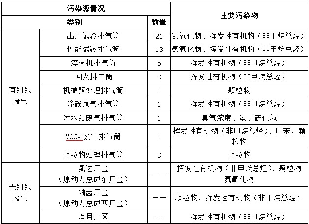 新能源动力总成事业部出厂试验室对发动机试验尾气进行收集,通过15m高排气筒排放;性能试验室尾气经过三元催化装置后由15m高排气筒排放;淬火机及回火机废气经机械过滤后由15m高排气筒排放;机械预处理废气经湿式除尘装置后由20m高排气筒排放;轴齿热处理废气经“尾气燃烧+水吸收”后经20m高排气筒排放;VOC废气经“吸附+燃烧”处理后经15m排气筒排放;激光焊接废气经滤筒除尘设备处理后经15m排气筒排放;激光清洗、激光打标等废气经滤筒除尘设备处理后经15m排气筒排放。